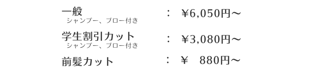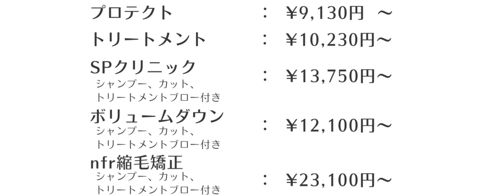 | 備考 | 最終受付 カット:19:00 パーマ:18:00 カラー:18:00 縮毛矯正:16:00 |